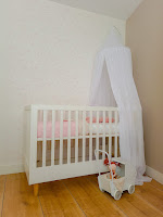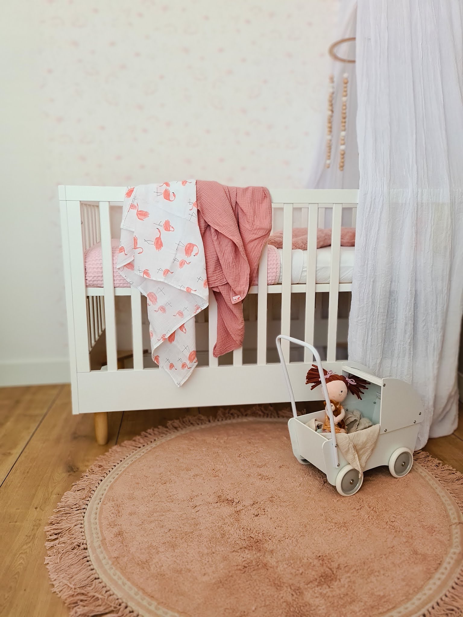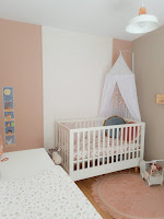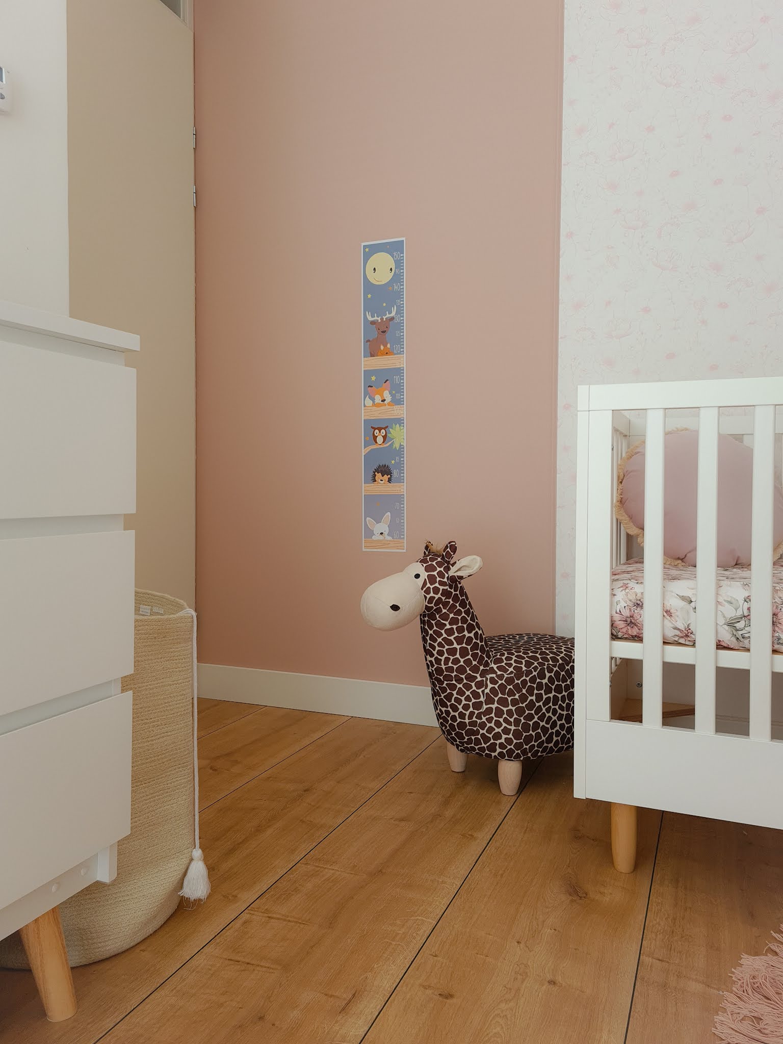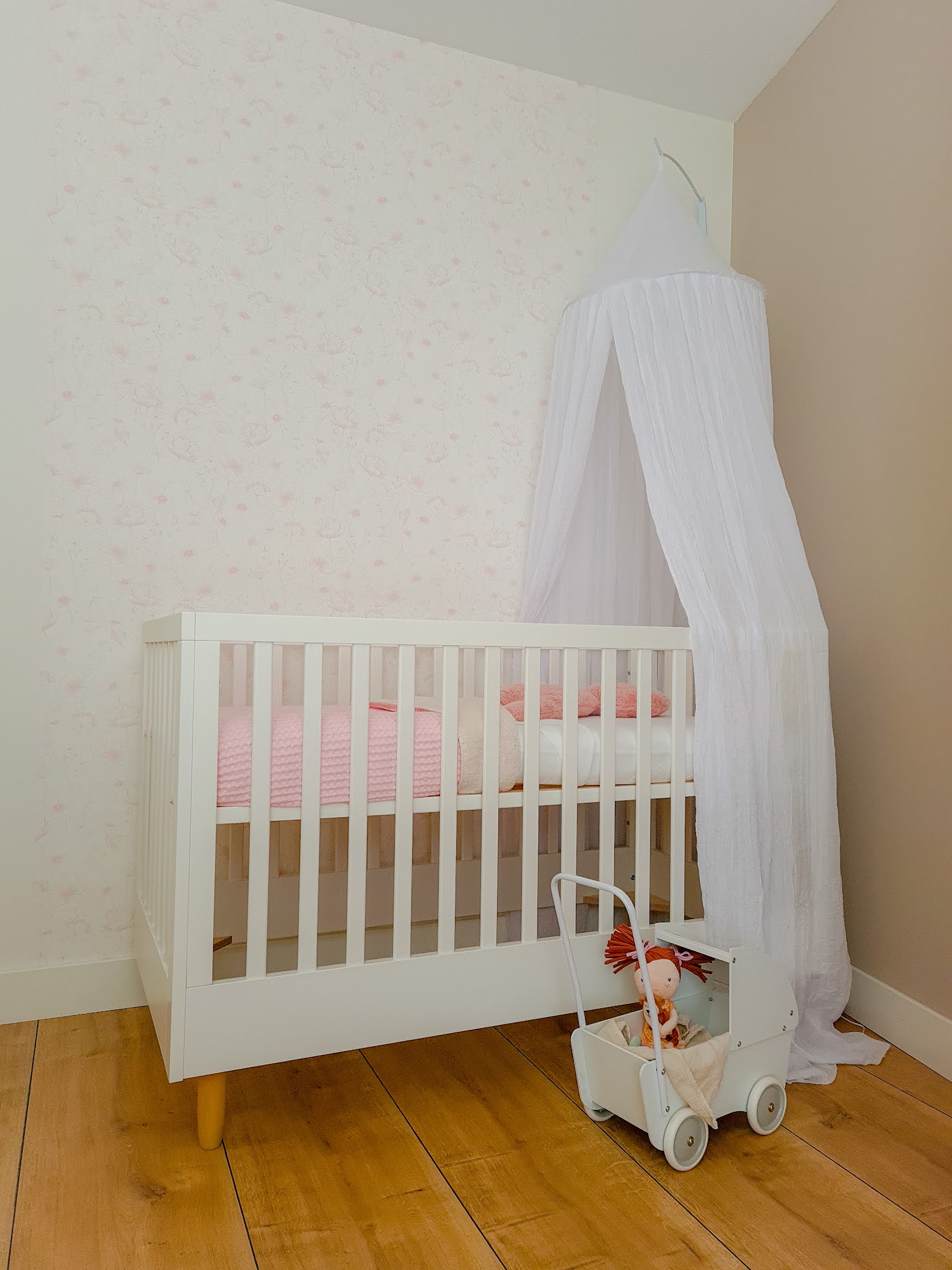 The furniture is white, the walls were white (with the exception of one wall, which is a light sand colour) and I had bought a white mosquito net (in hindsight I would have preferred it in a different colour, but well, this is a lesson for the next time). The room didn't feel warm and it was too bare. I decided to buy a carpet. A round, old-pink carpet by Tapis Petit. Yes, the room immediately looked better. But I was still not satisfied.We have partly covered one of the walls with (surprisingly) a white wallpaper with a calm, pink floral print. Yet something was still missing from this wall. We painted the parts of the wall that were not wallpapered with an old pink paint and finished the strip of wallpaper with beautiful decorative frames that were also painted in the old pink color. The result is great and the room looks so much warmer now. It's a small adjustment that makes a world of difference. Since the white furniture all has small wooden details, such as the legs and the doorknobs, we also hung wood-colored wall storage. The room is finished! And how happy I am with the result. Hopefully Nore will like the room as much as I do.
