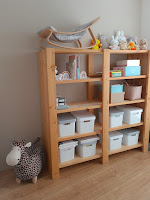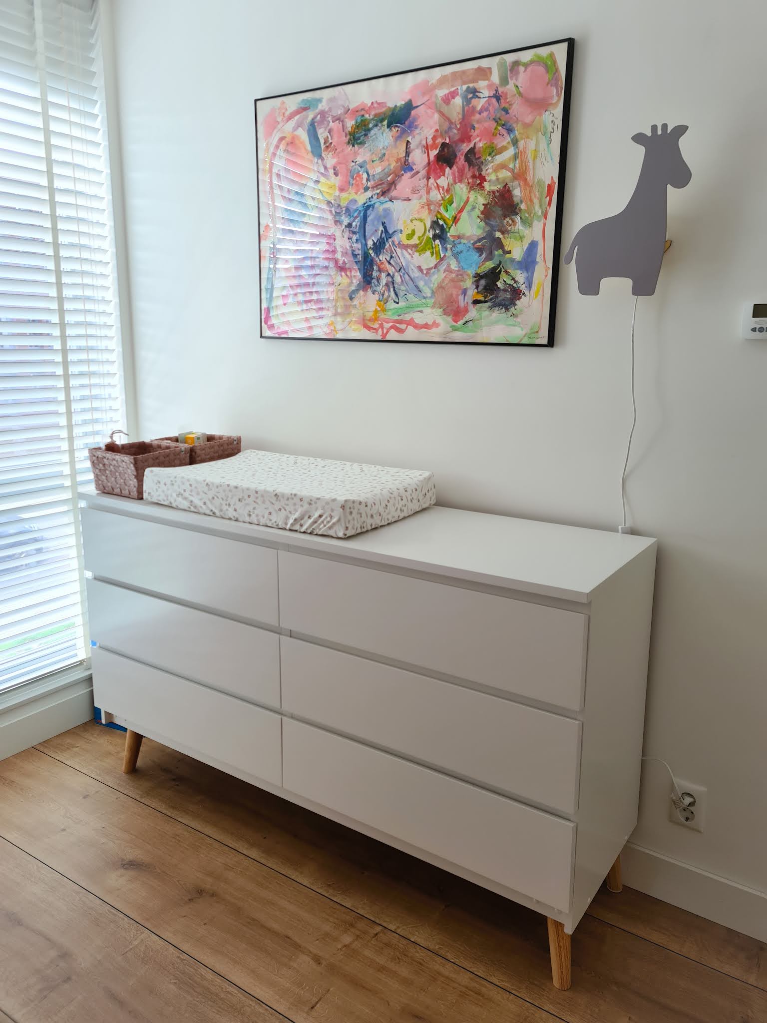 In my previous house I had a sloping roof on my bedroom. The well-known Malm chest of drawers from Ikea fitted perfectly here at the time. This white cabinet has been moved to our new home and I wanted to transform it into a chest of drawers. However, I had the lower model, which made it too low for a changing table. That's why I bought wooden legs, again matching the bed, and we made these, with the help of my father, under the Malm cupboard. Voilà, a budget-proof and beautiful chest of drawers was realized.