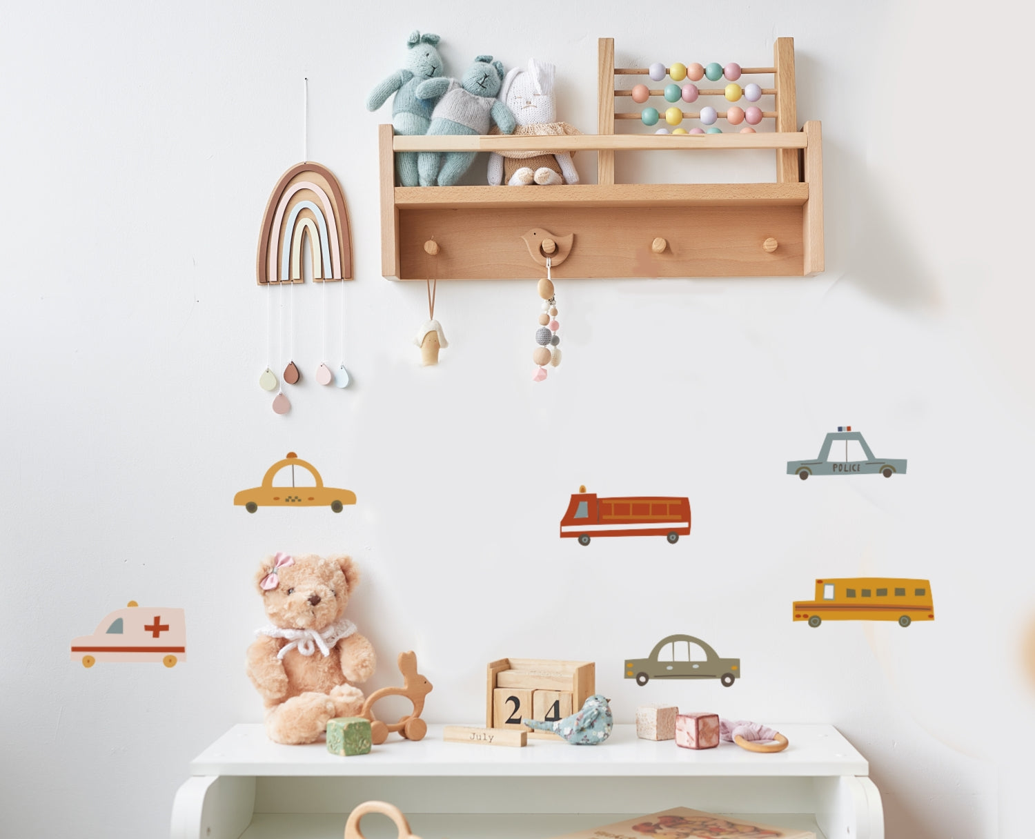 Ontdek onze schattige retro auto's als muurstickers. Retro design, met een moderne strakke uitstraling. Deze kinderkamer muurdecoratie houdt de babykamer interessant en voegt mooie warme kleuren toe voor een gezellige sfeer.