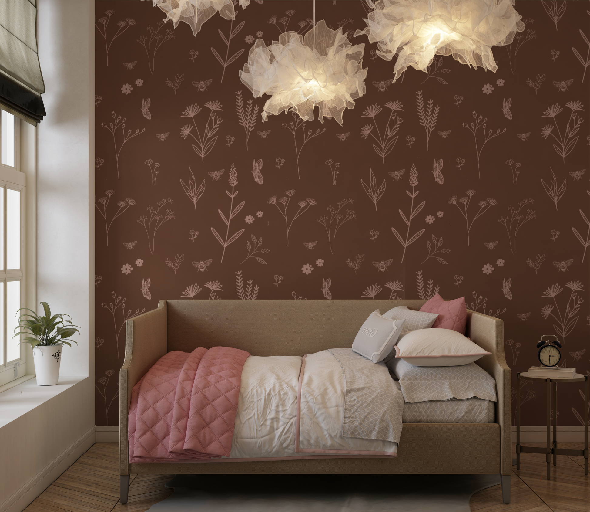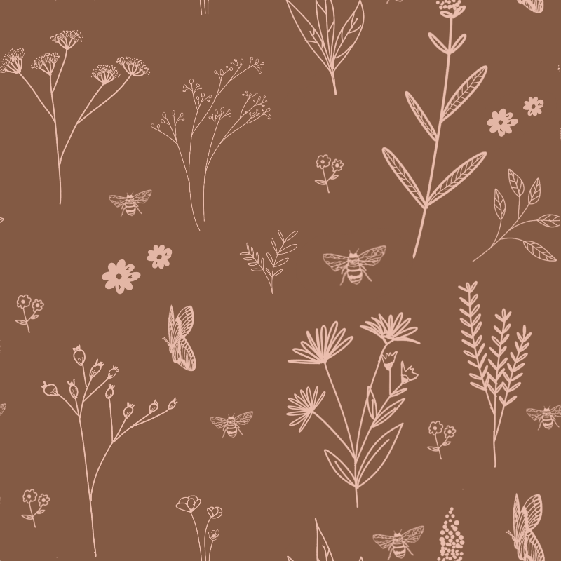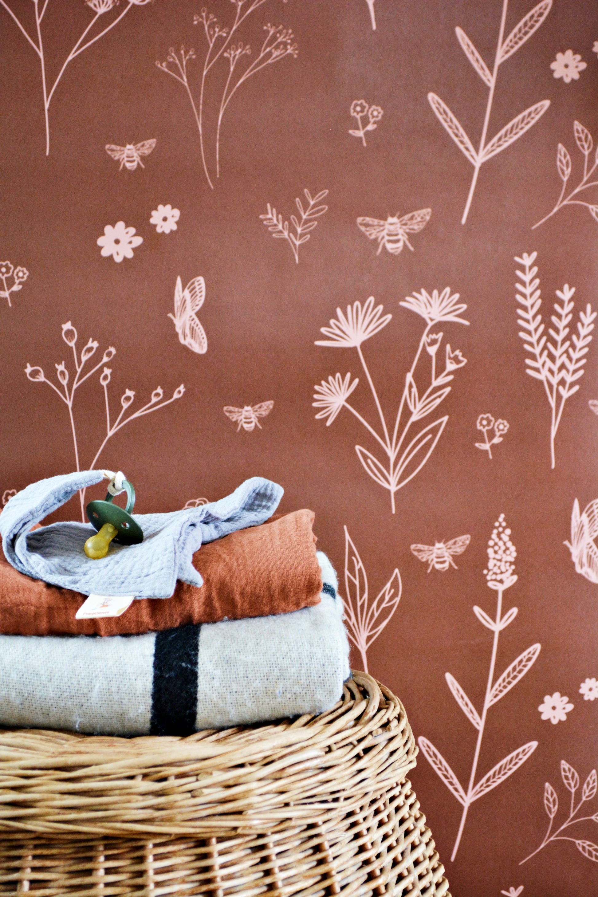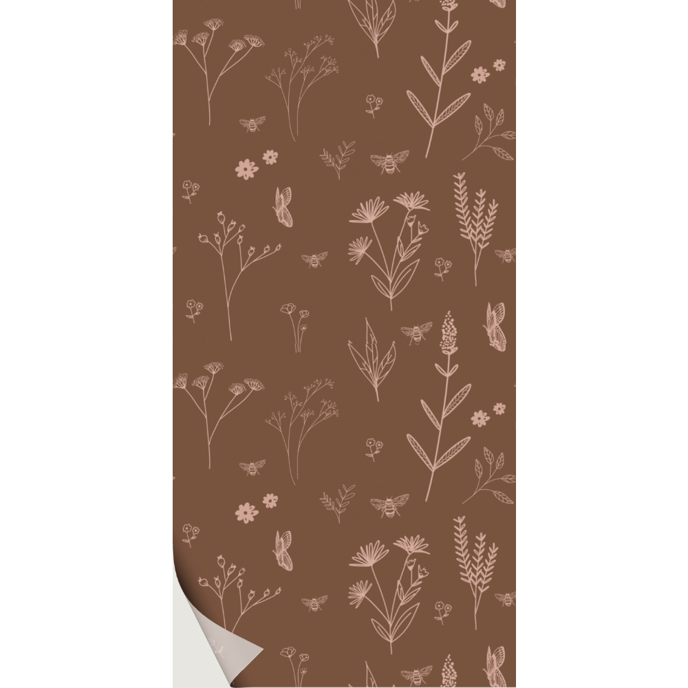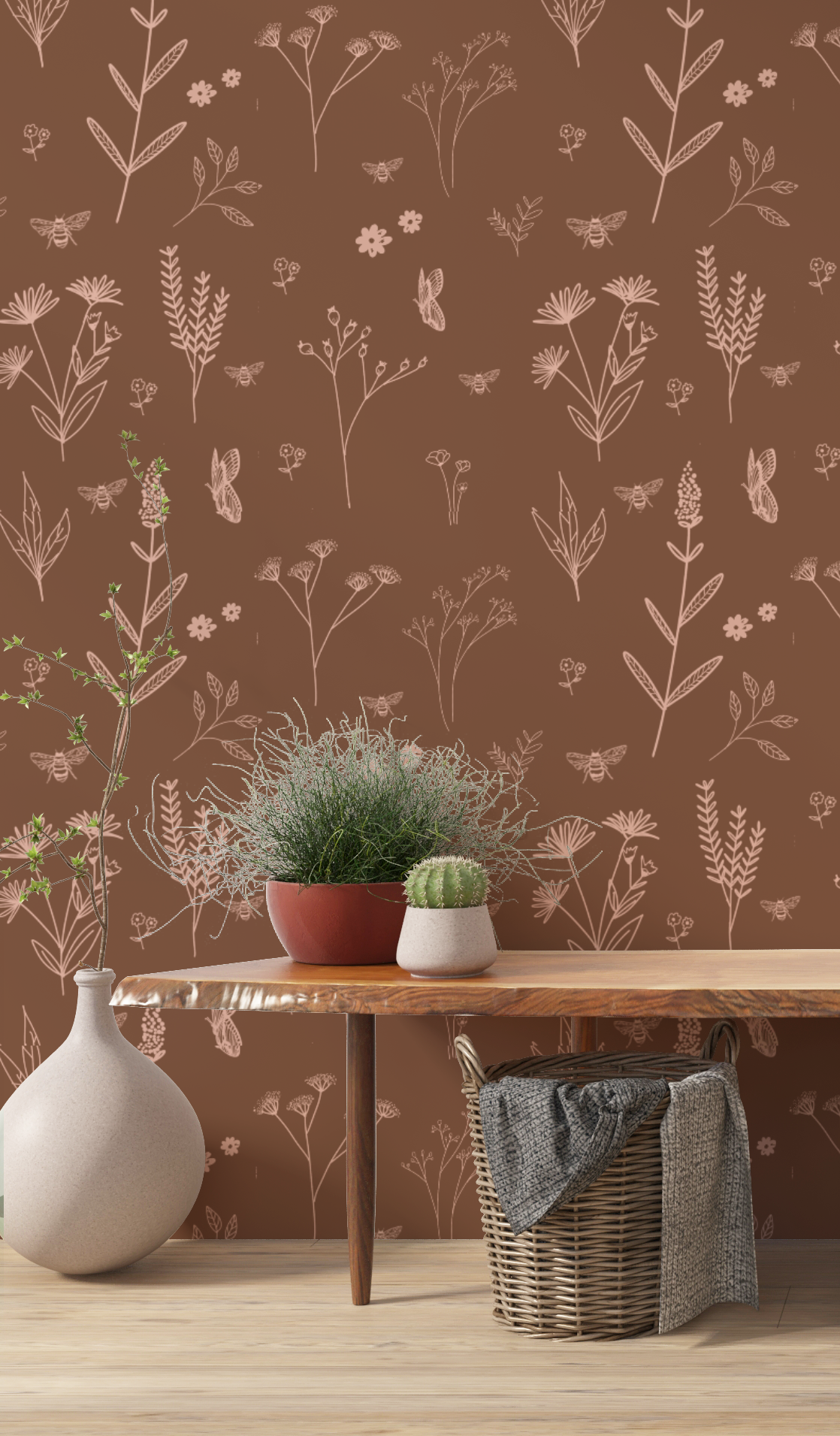 Dit behang is een eenvoudig maar prachtig behang met tekeningen van wilde bloemen. De roestkleurige achtergrondkleur geeft een mooi, warm gevoel aan elke ruimte.