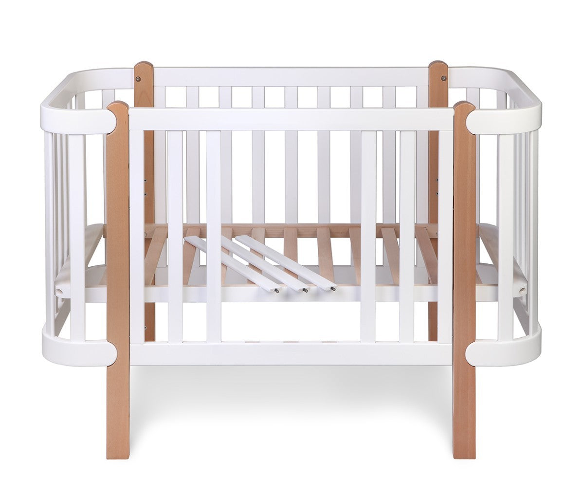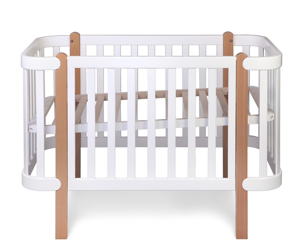Het heeft speciaal ontworpen, afgeronde zijkanten die het anders maken dan andere kinderbedjes. Het heeft vier matrasbodemhoogtes en een innovatieve mogelijkheid om het matras in een hoek van 3 graden te plaatsen. Een schuine slaaphouding wordt vaak aanbevolen om verkoudheidssymptomen, kiespijn en oorpijn te verlichten. De schuine slaaphouding bevordert bovendien de spijsvertering en ondersteunt de ademhaling van de baby.